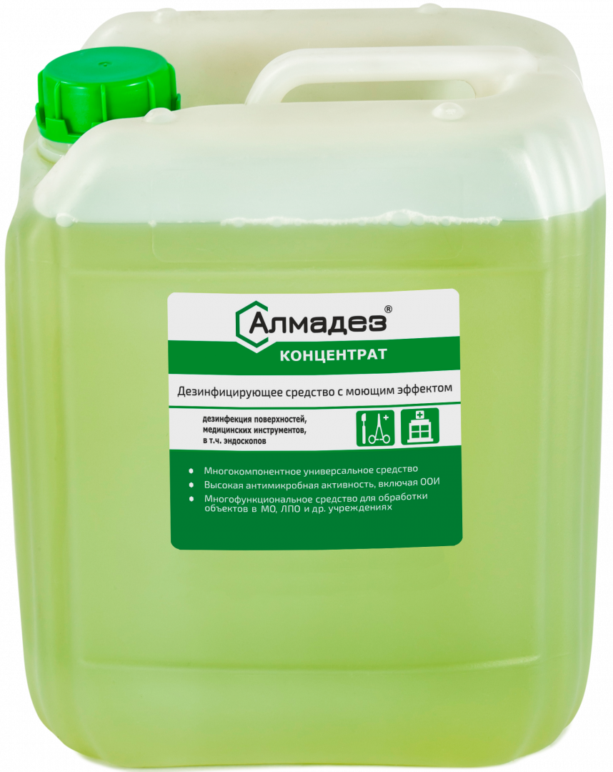 - рабочие растворы средства «Алмадез» — прозрачные, бесцветные, обладают слабым специфическим запахом;