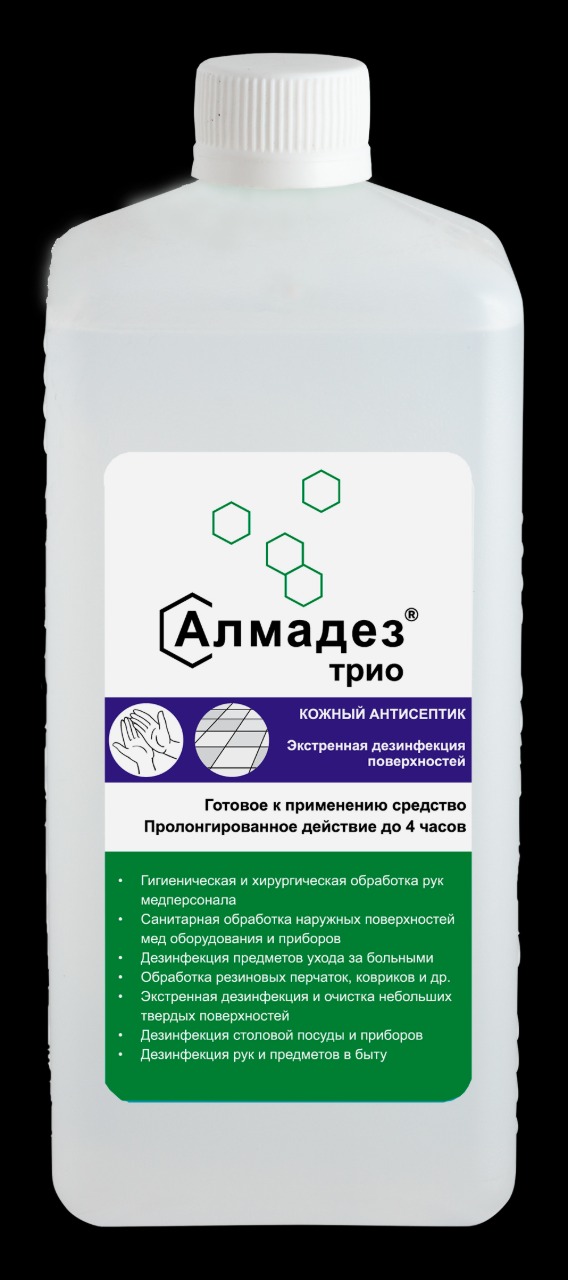 «Алмадез-Трио» — это профессиональный кожный антисептик на основе смеси спиртов (71%), готовый к немедленному применению. Эффективен для гигиенической и хирургической обработки рук, а также для быстрой дезинфекции небольших поверхностей и медицинского оборудования.